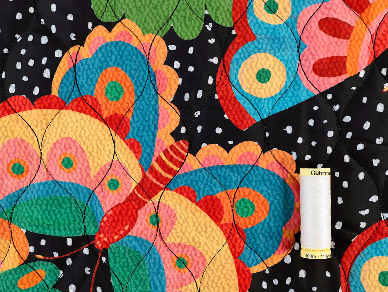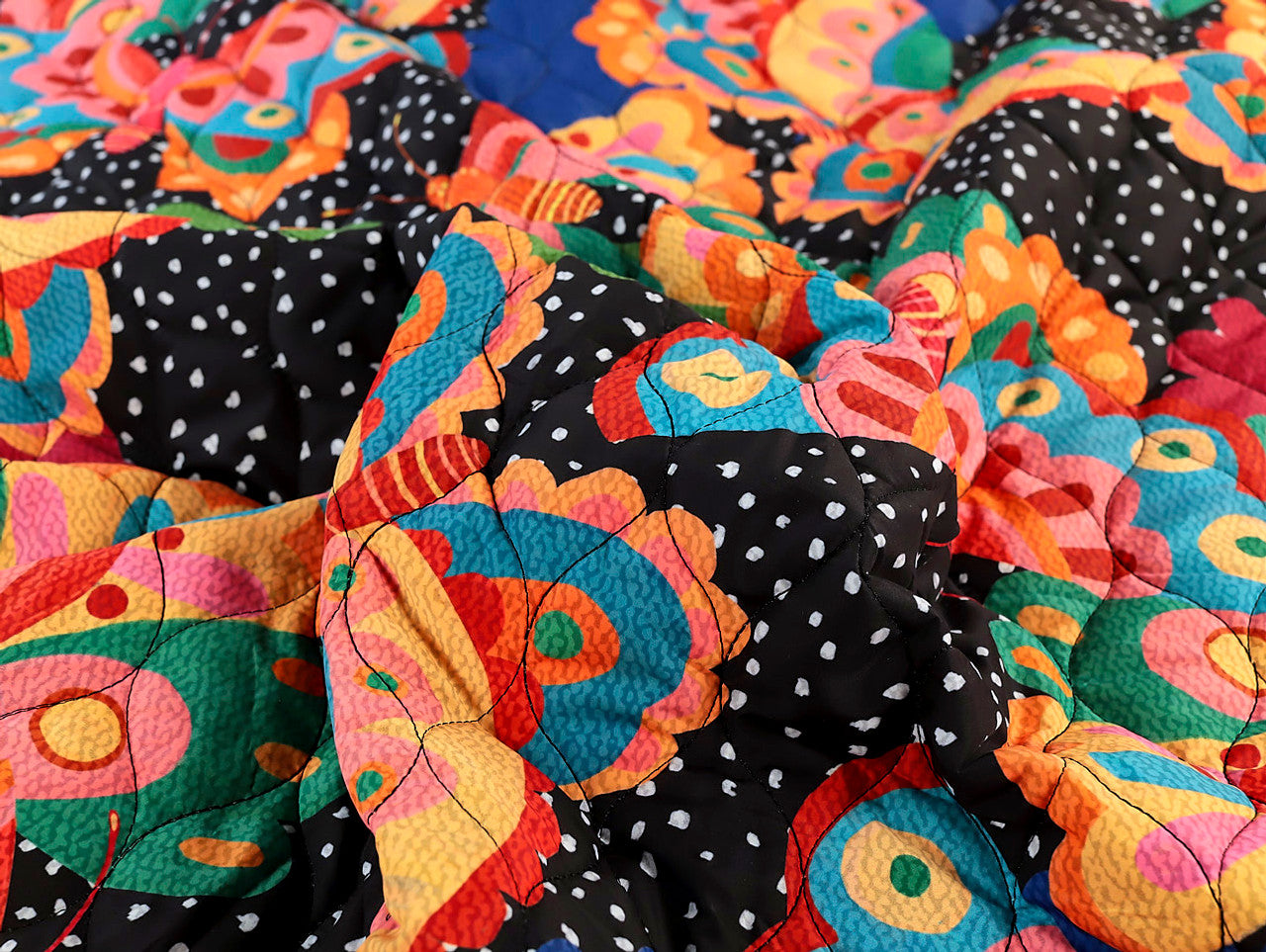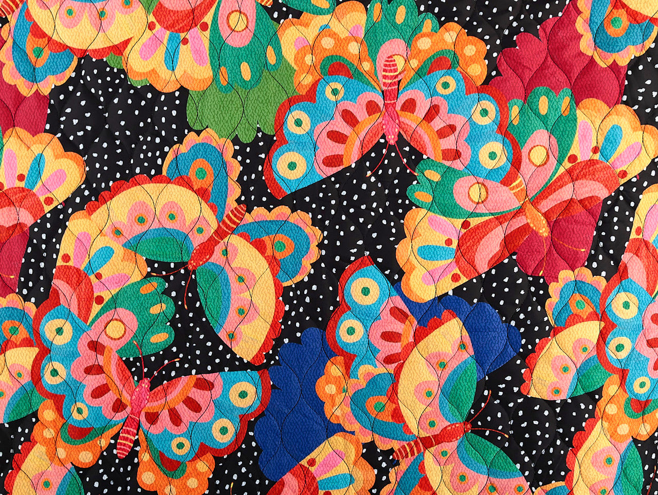 Bright butterflies flutter across a playful polka dot backdrop in this Fabric Godmother exclusive print. Printed onto a water-resistant quilted reversible puffer fabric, it’s perfect for creating stylish outerwear and accessories.